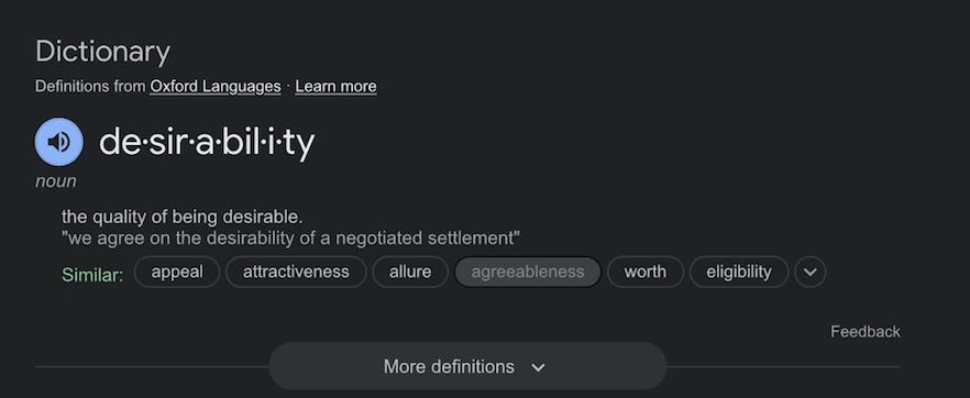 Desirability politics concern beauty standards that establish a hierarchy of existence. Usually, this is racialized and dependent on the physical features of different racial groups.
